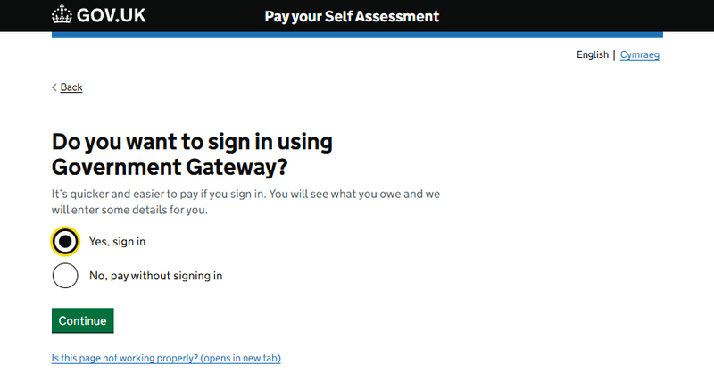 If you decide to pay your Self Assessment tax bill via Government Gateway, you simply need to sign in as usual. These are the same details you used to submit your Self Assessment tax return: