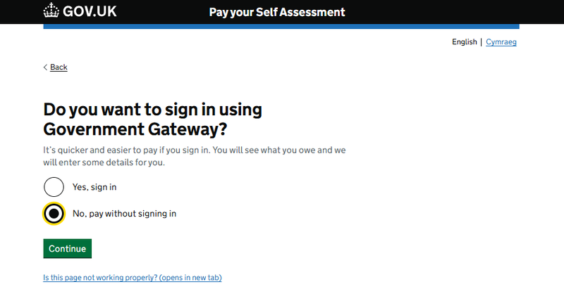 It’s possible to pay your tax bill online without signing into Government Gateway. To do so, begin by selecting that option: